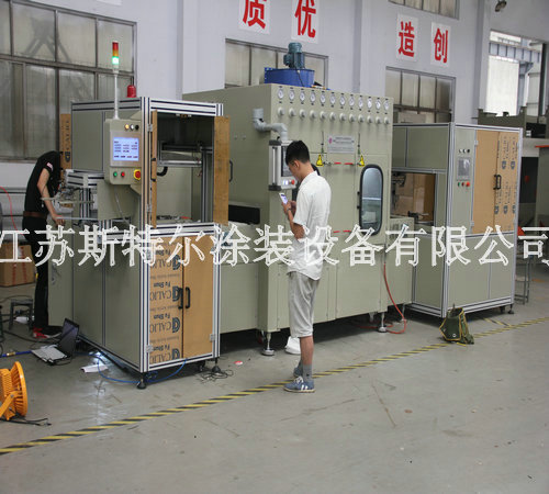 全自動玻璃水砂自動噴砂機由自動上料機、自動噴砂機和自動下料機三大部分組成:首先由自動上料機將附有兩組Tray盤Port可自動交換,需人工放Tray盤至LD Port, Tray盤定位后,移栽Arm開始取片,玻璃整列,再由移栽Arm直接將玻璃放置在載具Stg上,送入噴砂設備,當一個Tray port 取完后,會報警提醒人員裝載新的Tray盤,當空Tray盤滿杯后設備會自動報警通知人員取走空Tray盤,以此循環動作.然后到全自動玻璃水砂自動噴砂機,由人工自行調配一定的水砂比例后設備自動進行混合攪拌,自動上料機構抓取玻璃放到輸送同步帶上,進入噴砂機腔體進行噴砂,噴砂作業結束后,進入水刀處進行噴淋,噴淋結束后由風刀進行吹干。吹干后移動至下料機移栽位置,由移栽將玻璃抓取至下料機FORK上,以此循環。噴砂、清洗、吹干區域有擋邊防止工件位移。最后自動下料機將附有兩組CST Port可自動交換,需人工放空的CST至UnLD Port, CST翻轉90°后,氣缸機械定位,由移栽arm從治具上取玻璃放置Fork上,送入CST, CST Port內的基板利用Fork方式由最高層開始放片,Fork 真空感知Sensor/玻璃光纖sensor OFF后,Fork自動退回到等待位置,以此循環。當CST裝滿后,設備會報警提示人員將CST取走并裝入空的CST。