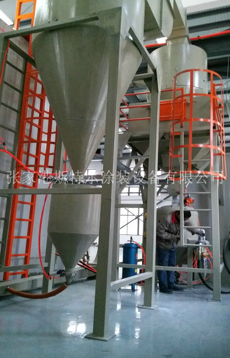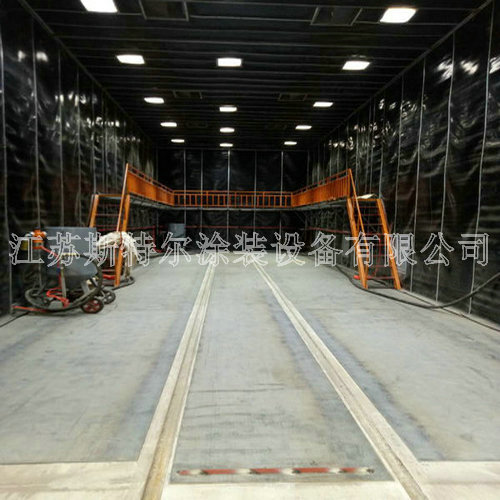 根據客戶要求及工件尺寸,房體工作尺寸設計為18x6x6.5m。本噴砂房體所使用100mm方管做總體三層架構,內部所使用50方管做內部承載,內部鋪2mm厚不銹鋼板及3mm橡膠材料板,或是壁墻所使用50mm厚彩鋼夾心板夾心板夾心板產生,外型不美觀、進行安裝節省時間、防蝕實用。彩厚不銹鋼板夾心層為聚苯乙稀發泡朔膠,與常用用純厚不銹鋼板制成的