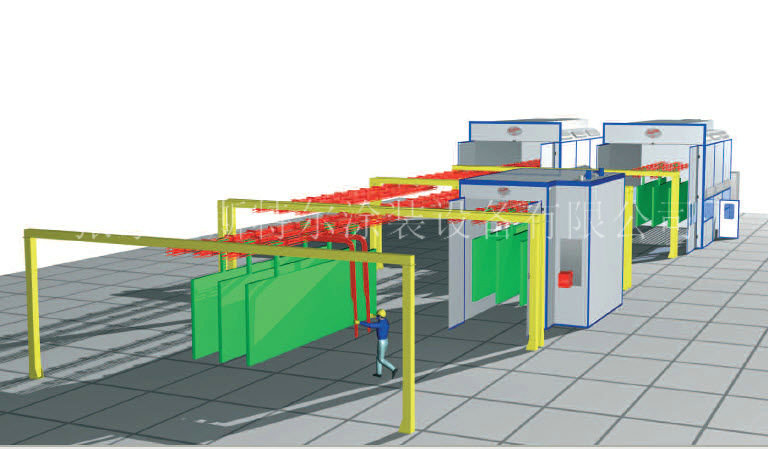 傳送機表明工作工藝方案進行科學合理的布局合理的設計,連接各工作制作工藝(前外理、噴粉室、汽車噴漆室、應用烘道等),縮減活動人工,延長工作的周期,提工作速度。